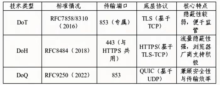 为解决传统DNS隐私问题,IETF制定了DoT、DoH、DoQ三大加密标准,核心是在客户端与递归服务器间建立加密连接,三者技术差异如下表所示: