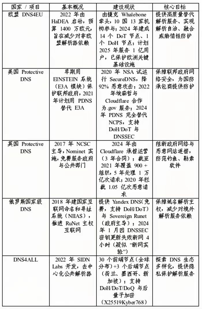 随着DNS加密技术(DoT、DoH、DoQ)普及,恶意活动(恶意软件、僵尸网络、钓鱼等)借助加密通道隐蔽通信,进一步加剧安全风险——DoH 流量与 HTTPS混杂导致监管盲区,境外加密DNS服务可绕过国内ISP递归服务器,2024 年国际 DoH服务商超百家,跨境恶意流量激增。在此背景下,保护性DNS(PDNS)概念应运而生,其由政府管控,融合高解析质量与DNS层安全防护,为政府部门、关键基础设施提供稳定安全的解析服务。2017年英国NCSC首次提出国家级PDNS计划,美、英、澳、欧盟等相继推进建设,构建PDNS基础设施已成为国际共识。