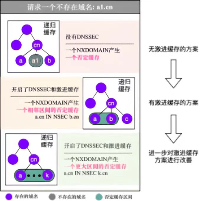 (注:RFC 8198于2017年成为正式标准,2018年发布的BIND 9.12版本首次实现了激进缓存技术并被作为了默认开启的配置项。最新的探测研究表明互联网上过半数量的递归解析起具备激进缓存能力。)