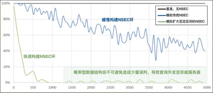 确定性:若查询名称不存在于概率性数据结构中,则必定不在区域中。这是概率性数据结构自身特性所决定的,这个特性配合DNSSEC校验可以用于验证所请求域名的不存在性。
