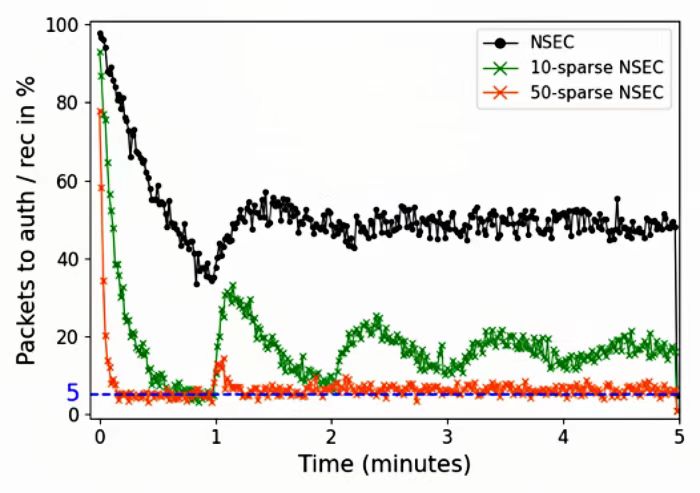 测试区包含10万个机器生成的域名,NSEC的TTL被设置为60秒。该测试针对此区向递归持续发送不存在子域名查询,模拟5分钟的NXDOMAIN攻击。该测试记录了递归和权威之间的流量比例。
