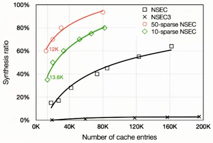 具体而言,由于NSEC或NSEC3记录这些否定应答记录包含了所请求域名前后的两个距离最近的存在域名,因此可以用来证明两个存在域名之间的域名都不存在。这解决了无法对不存在域名进行穷举这个关键问题。部署了激进缓存的递归解析器能够利用已验证的否定应答记录,直接合成NXDOMAIN或NODATA等否定响应,显著减少了发往权威服务器的查询数量。